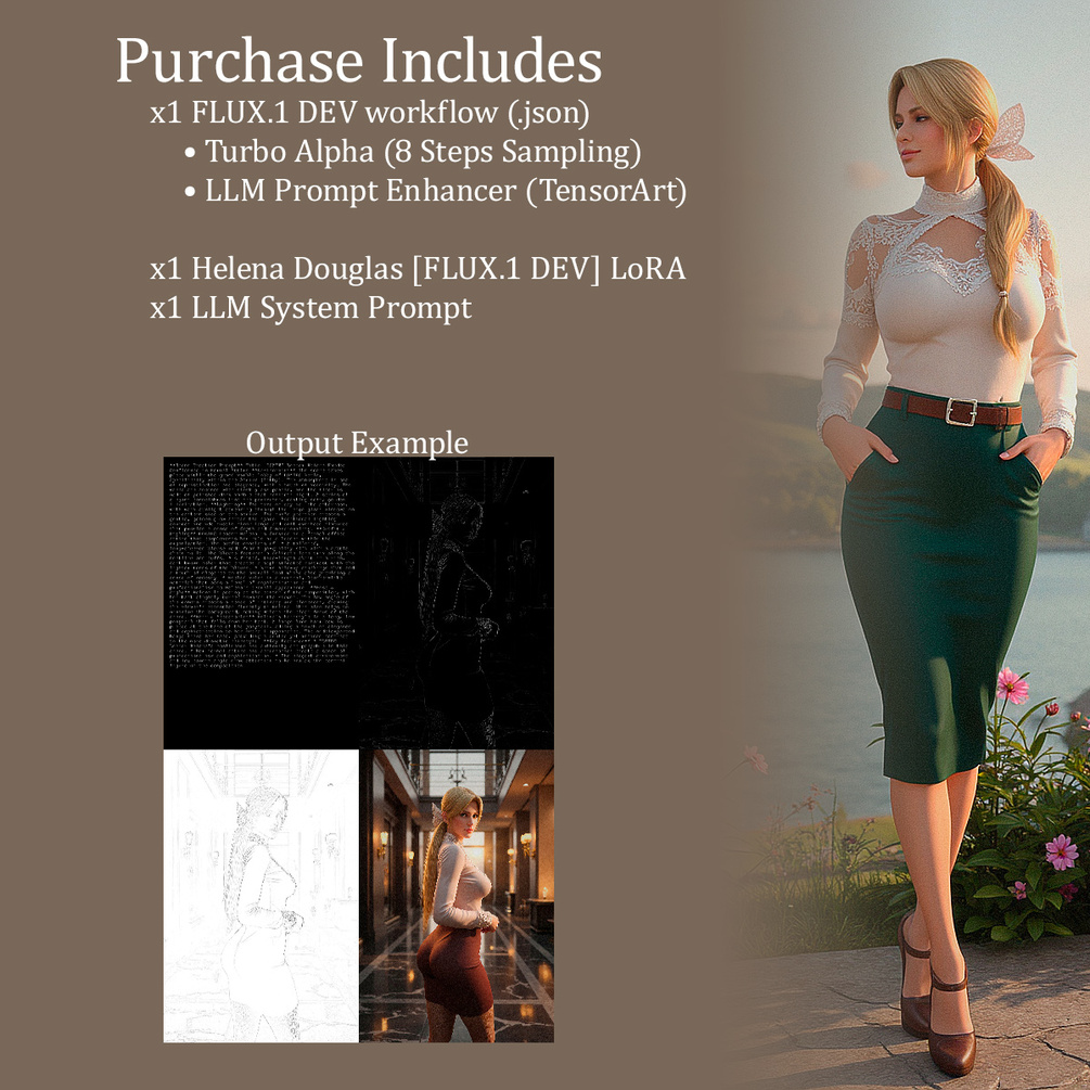 Supercharge your AI-generated art with this Helena Douglas (Dead or Alive) LoRA and a highly optimized FLUX.1 DEV workflow designed for precision-tuned image generation. Whether you’re refining AI outputs for professional use or seeking an efficient workflow for multi-stage image processing, this package delivers exceptional results.